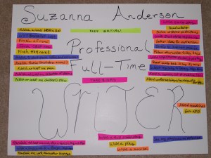 Feeling creative enough to use glue, I made a poster with all of my writing/reading/translating goals and hung it near my writing space. So I can look at it but not let it not distract me from what I’m working on at hand.