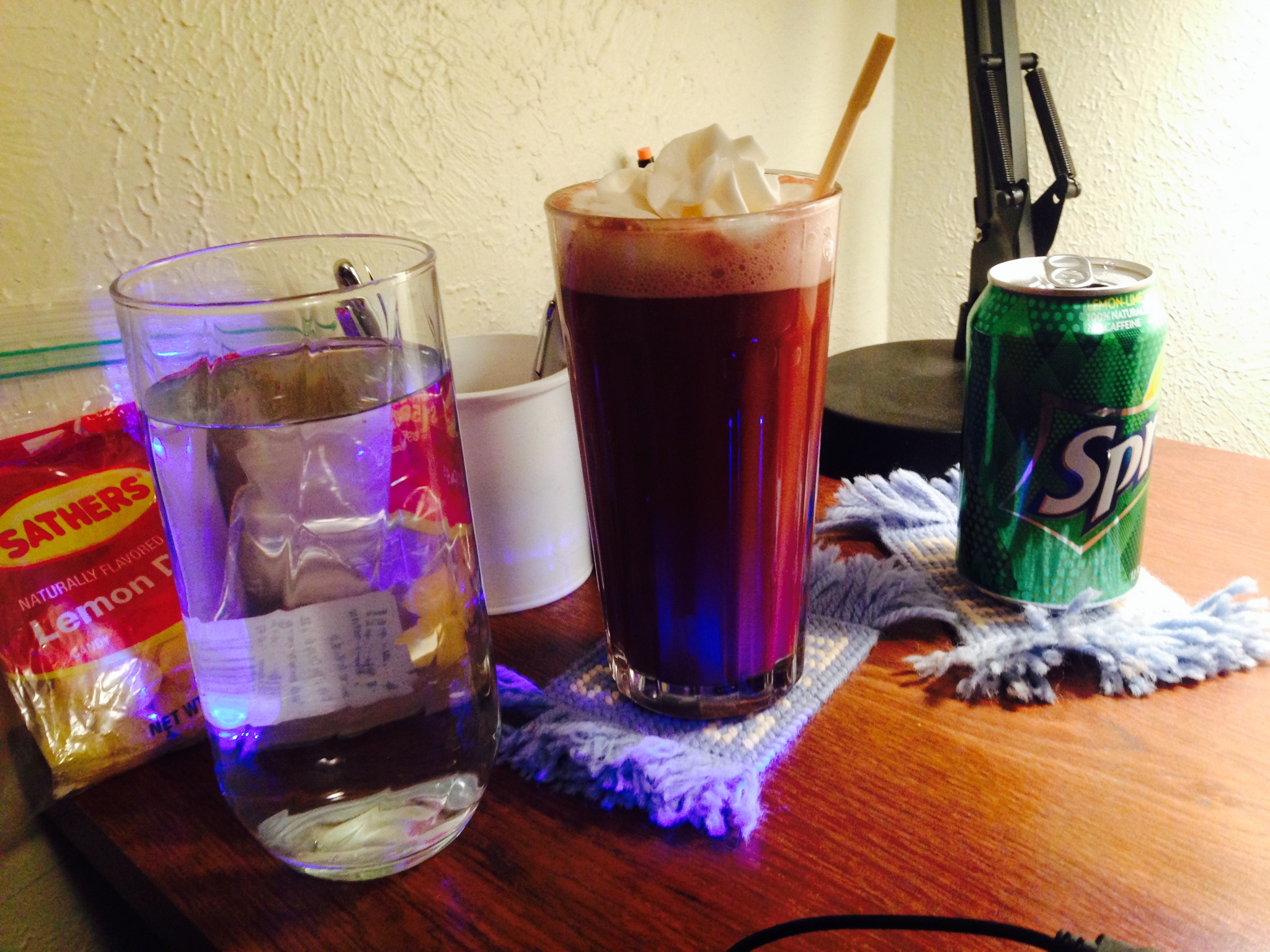Staying hydrated with water, raspberry hot chocolate, and Sprite. I’ve always loved the raspberry hot chocolate at Grounds for Thought, so I decided to buy raspberry syrup and try making them at home. Best. Idea. Ever.
